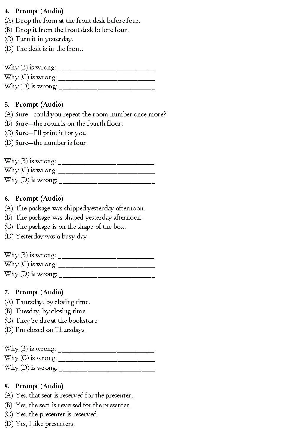 - Listen and Choose a Response: 1-2 cümlelik kısa bir soru veya ifadeyi dinleyin ve en doğru sosyal cevabı seçin.